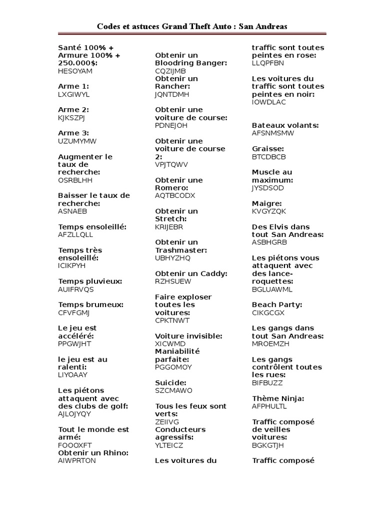 San andreas, à entrer pendant le jeu et en majuscules (un message apparaîtra à l'écran si l'opération a réussi).